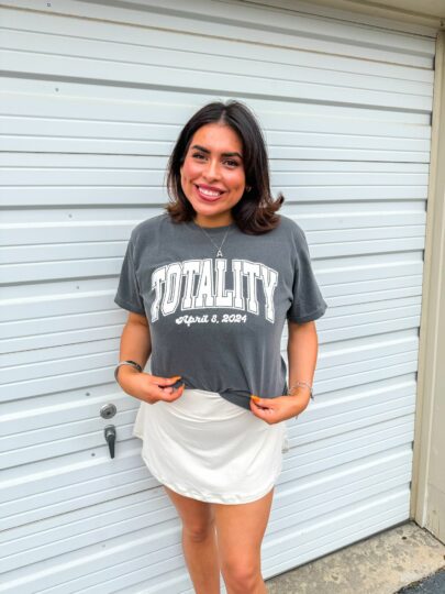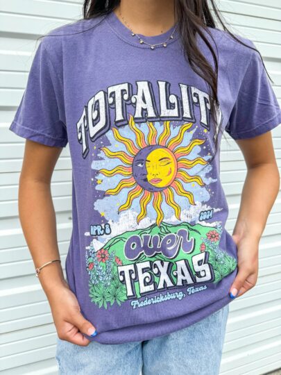 Want something a little more retro that showcases both the eclipse and location? Our Totality Grateful tee gives the cutest tribute to both Texas and the total eclipse. Bold colors, blue bonnets and a rad sun, we promise you’ll be wearing this more than once in a lifetime.