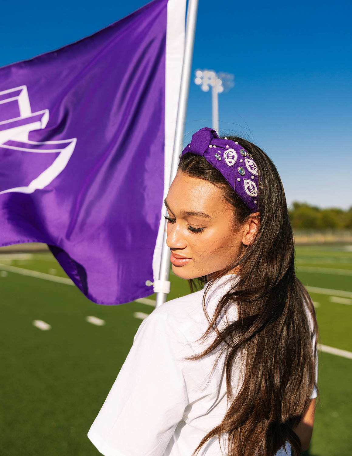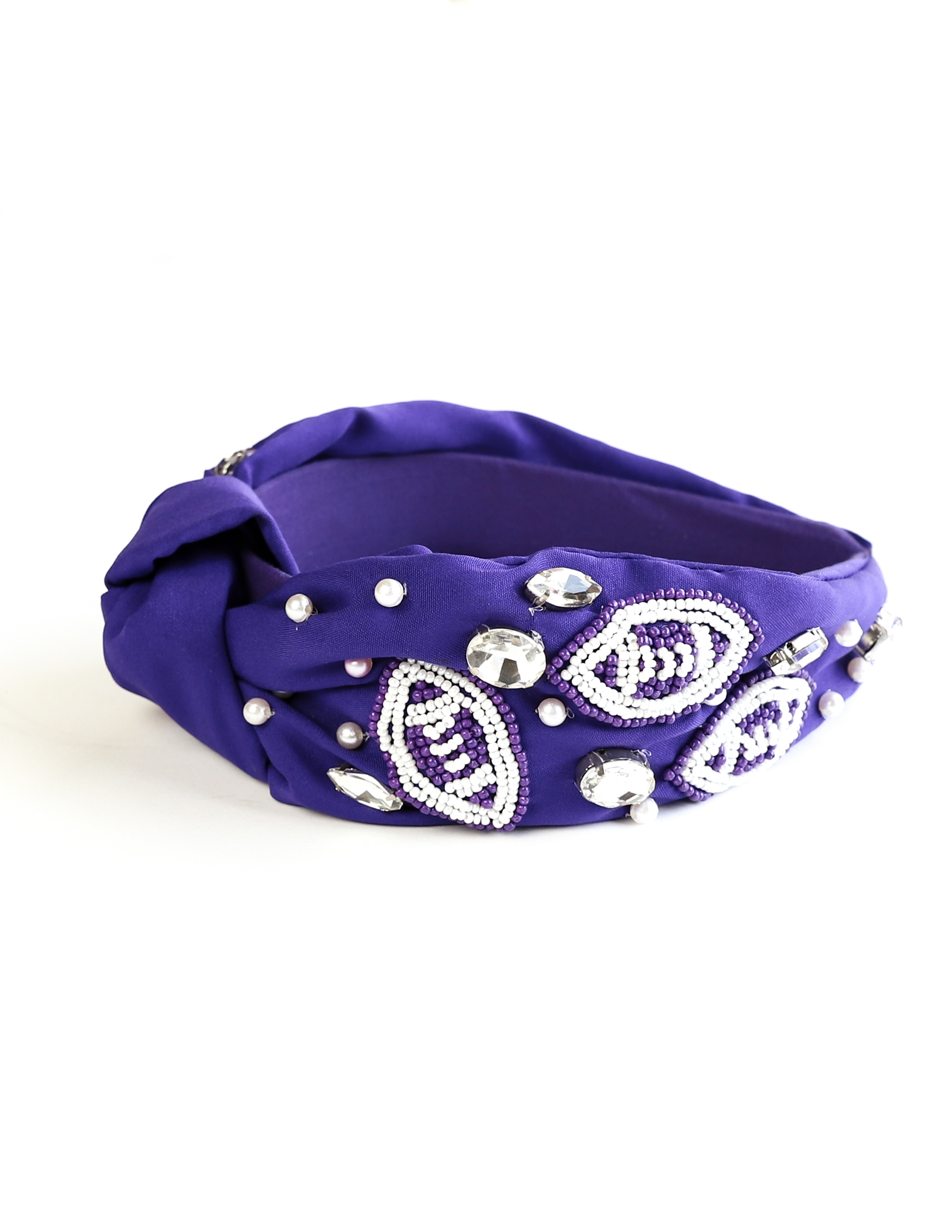 This Beaded Football Headband is perfect for football fans. It features all over beaded footballs and rhinestone embellishments. It’s the perfect accessory for everyday wear with the most comfortable fit!