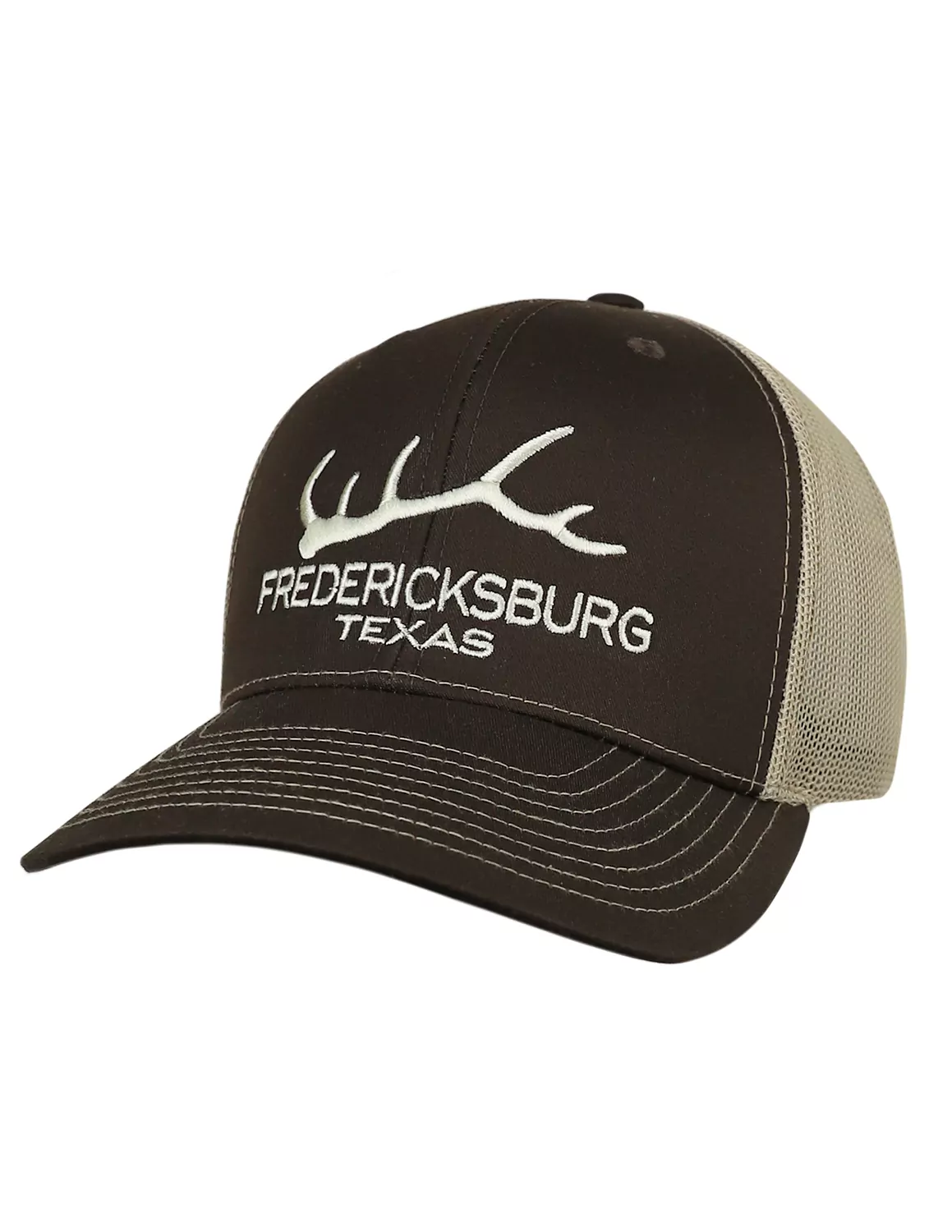 Adventure out in Fredericksburg, Texas! This adjustable mesh back hat features an elk antler, Fredericksburg, Texas embroidery and a mesh back.