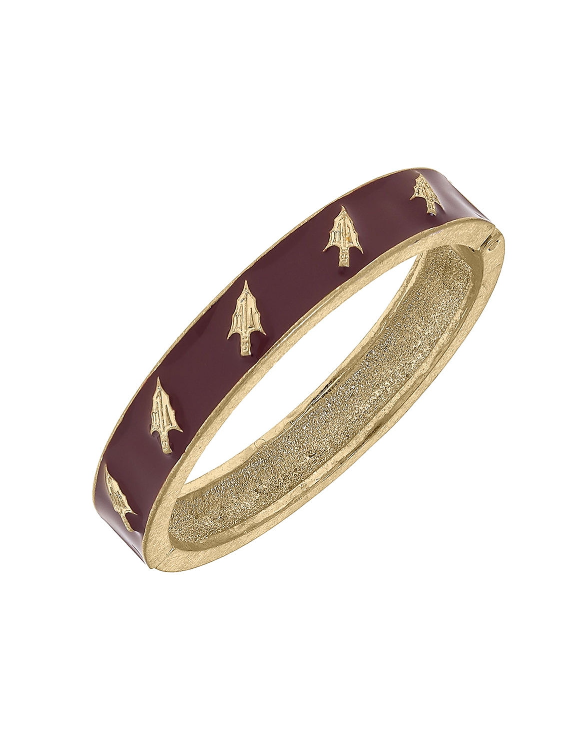 Add a splash of team spirit to your game day outfit with the Florida State Logo Enamel Hinge Bangle in Garnet. It features an enamel material with worn gold plating and team logo embossed around the bangle. Wear one, or build a stack!