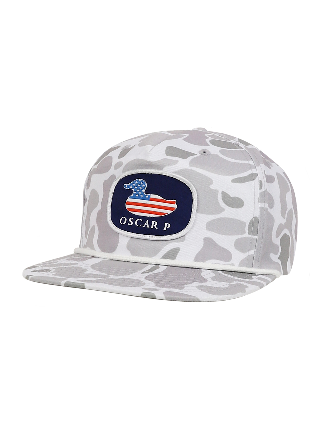 This camo hat with rope detail features a Oscar P flag patch- perfect for showing off your Texan pride!