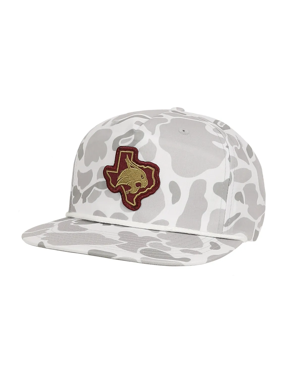 This camo hat with rope detail features a classic Texas State Bobcats logo patch- perfect for showing off your TXST pride!