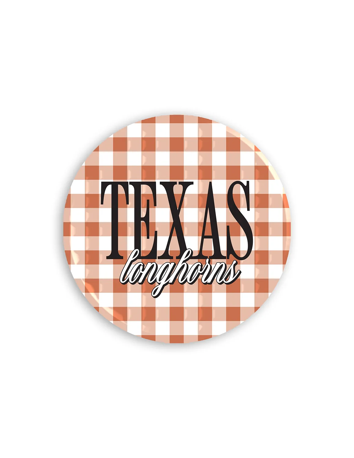 Add a stylish twist to your game day look with the Texas Longhorns gingham button! Featuring bold “Texas Longhorns” lettering on a burnt orange and white checkered background, this button is the perfect mix of school pride and classic charm.